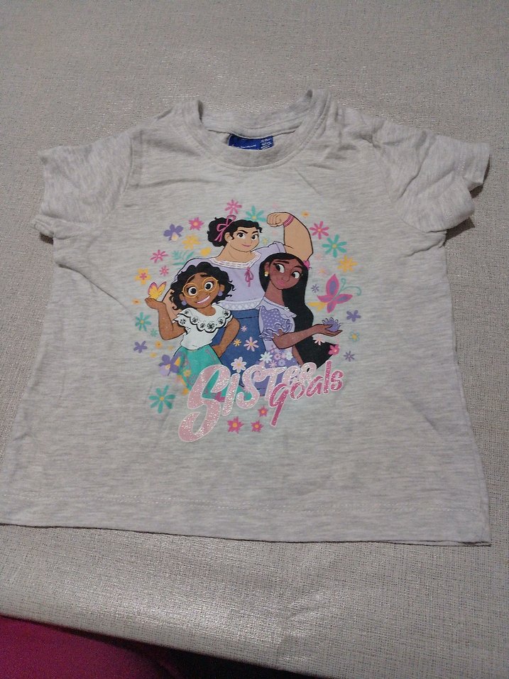 Kız çocukları için kısa kollu, yuvarlak yaka ve bol kesim gri tişört. Pamuklu yumuşak kumaştan, üç karakter ve çiçek desenli baskı bulunur. Trend sokak stili için uygun.