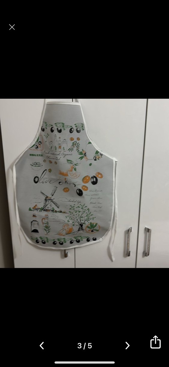 Zeytin, otlar ve yel değirmeni desenli gri mutfak önlüğü. Beyaz bağlama ipleri ve yumuşak kumaş dokusuna sahiptir.
