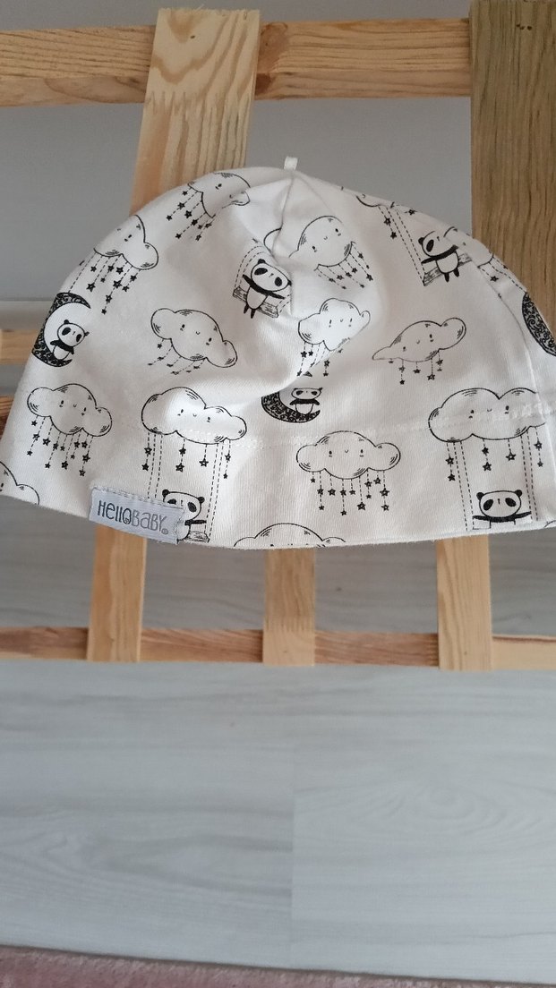 Baskılı bulut ve yıldız desenli, yumuşak pamuk kumaştan yapılmış gri bebek şapkası.