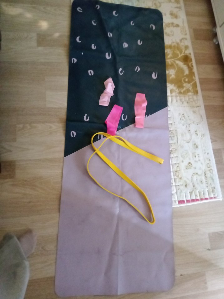 Gri ve pembe renklerde baskılı yoga kayışı, ayarlamalar için uzun sarı kayış ile birlikte. ♀️