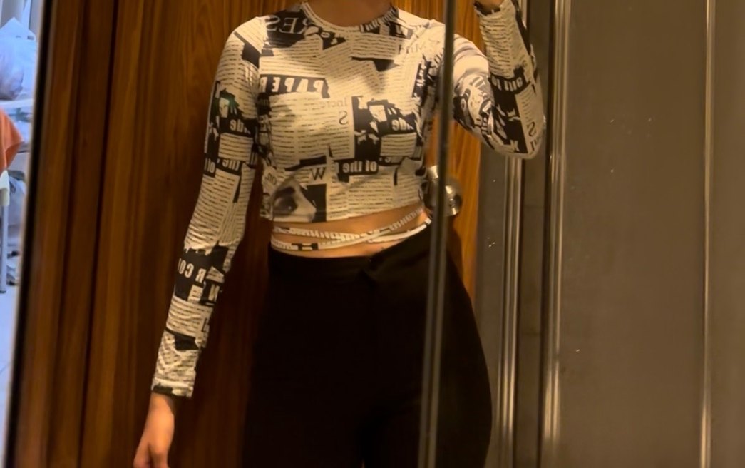 Dar kesim, baskılı siyah beyaz crop bluz. Uzun kollu, halter yaka ve belden bağlamalı detayı ile trend sokak stili sunar.