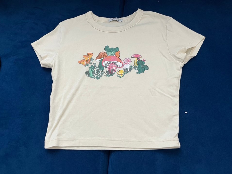 Pamuk kumaştan yapılmış, kısa kollu, yuvarlak yakalı ve bol kesim krem renkli kadın tişörtü. Üzerinde renkli mantar baskısı bulunur, rahat ve günlük kullanım için uygundur. Yarım tişörttür