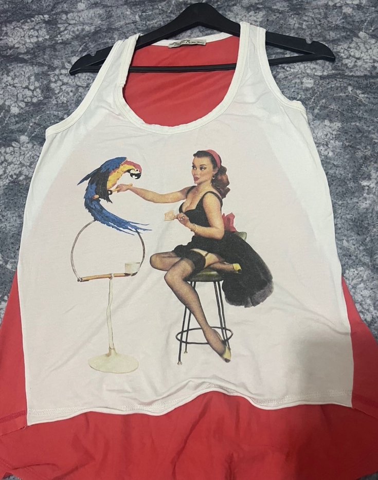 Pamuklu, beyaz, baskılı mini kadın atlet. Kolsuz ve halter yaka, bohem ve retro tarzı yansıtıyor.