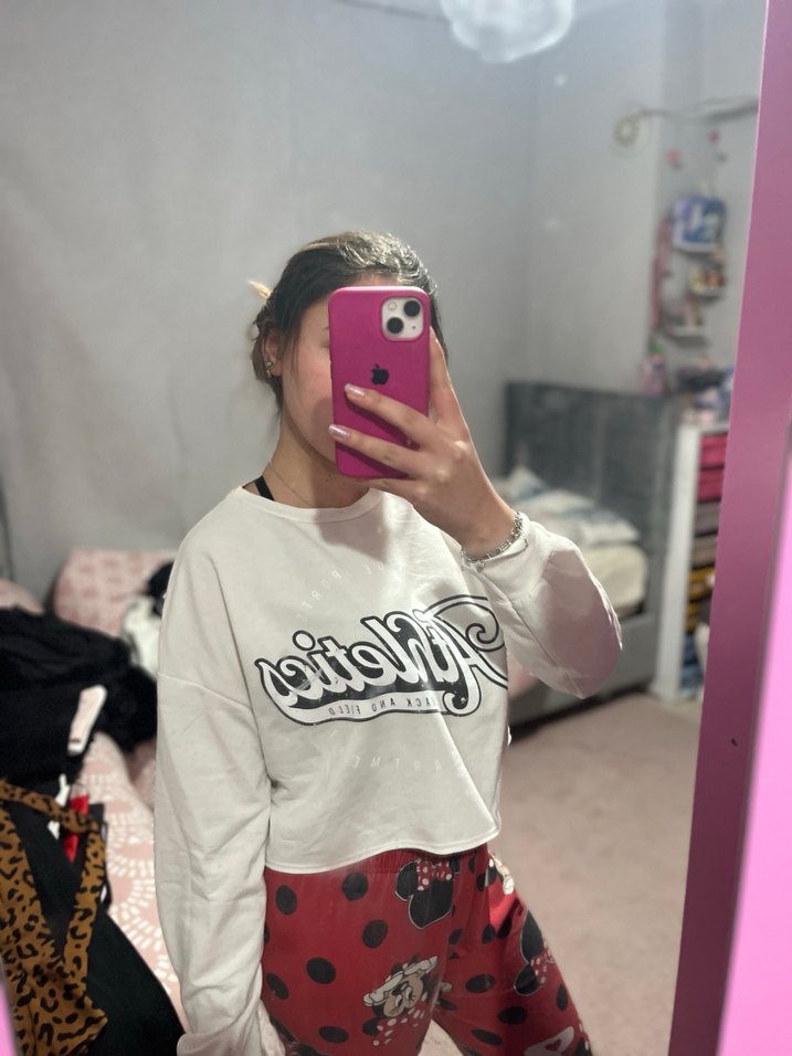 Pamuklu kumaştan üretilmiş, pembe baskılı, puff kollu, normal midi boyda, bol kesim kadın sweatshirtü. Günlük rahat stil için uygundur.