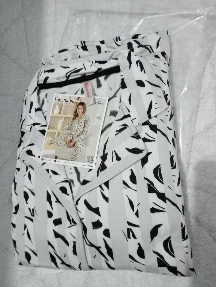 Kadınlar için bol kesim, kısa kollu, uzun boylu pijama takımı. Siyah beyaz baskılı desenli, rahat ve şık tarzda.