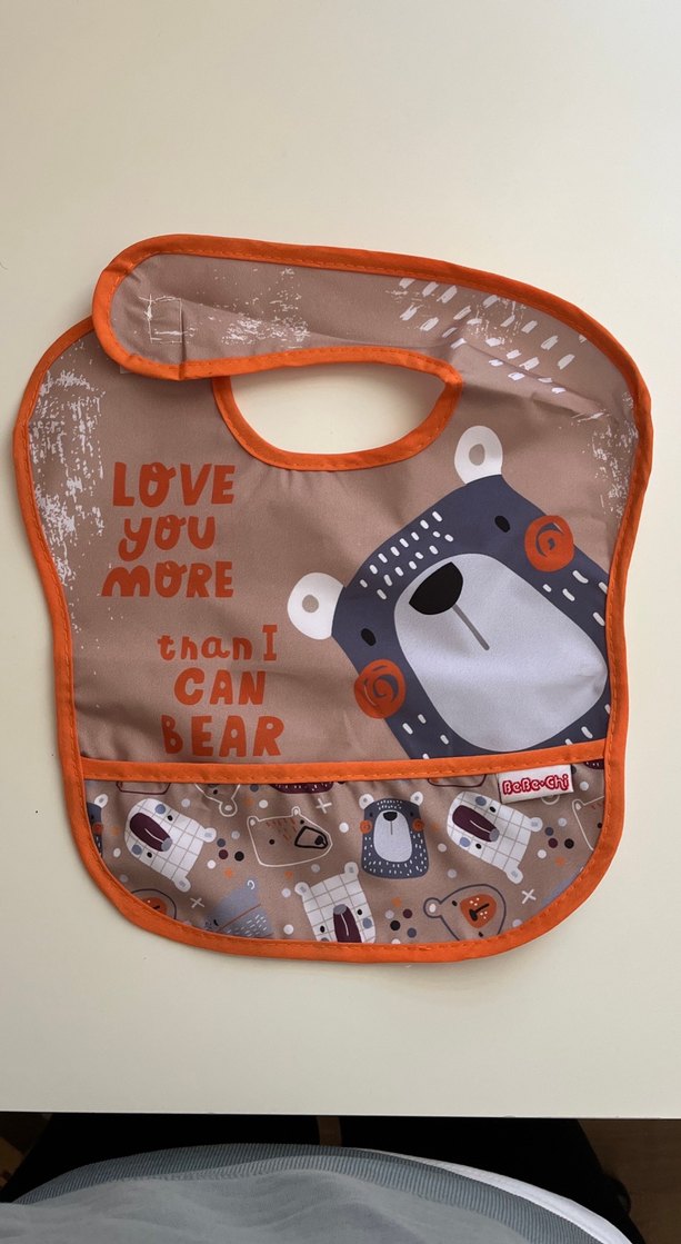 Kahverengi önlük, turuncu kenarlıklı, üzerinde baskılı ayı ve "LOVE YOU MORE than I CAN BEAR" yazısı bulunan sevimli bir bebek önlüğüdür.