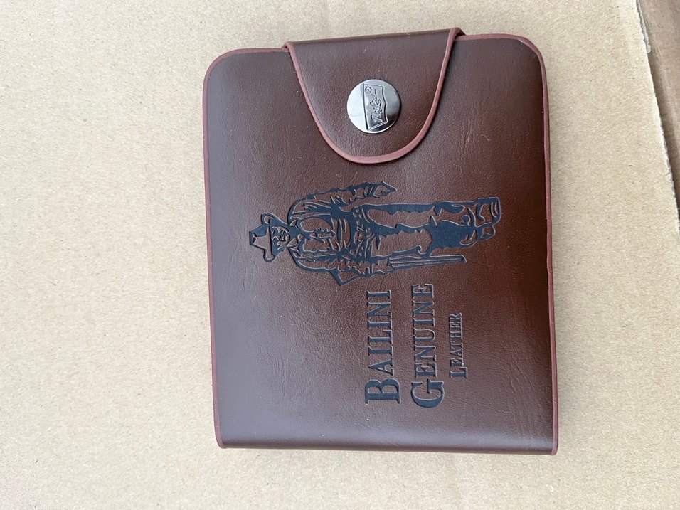 Koyu kahverengi gerçek deriden yapılmış, baskılı vintage biker figürlü ve metal düğmeli erkek cüzdanı. Parisli tarzına uygun. ️