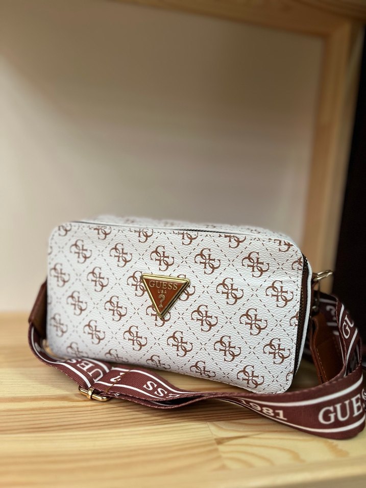 Baskılı desene sahip açık kahverengi deri çapraz çanta, markalı kemer askısıyla dikkat çeker. Günlük sokak modası ve bohem tarzlar için uygundur.