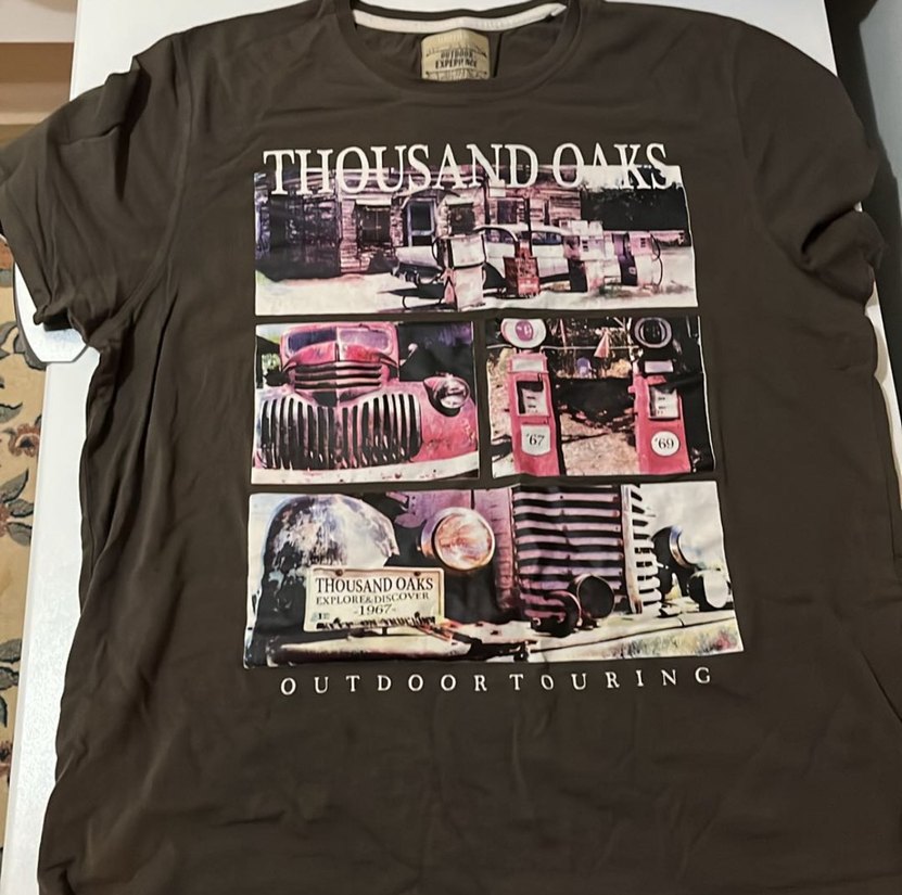 Kahverengi pamuklu, kısa kollu, yuvarlak yaka, bol kesim baskılı erkek tişörtü. Sokak stiline uygun vintage dış mekan temalı tasarım.