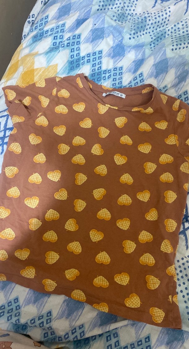 Pamuklu, kısa kollu, yuvarlak yaka, bol kesim kahverengi tişört. Üzerinde baskılı kalp desenleri ve düğme detayları bulunur. Rahat ve günlük kullanım için uygundur. ❤️