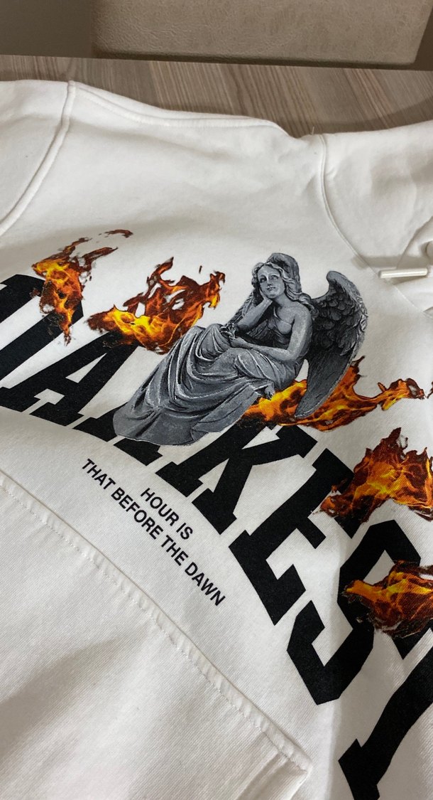 Beyaz renkli, kapüşonlu ve fermuarlı, bol kesim uzun kollu sweatshirt. Sentetik kumaştan üretilmiş, alevler ve melek figürlü baskıya sahip. Üzerinde 'KEST' yazısı bulunur.