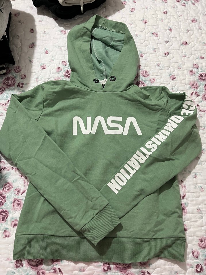 Yeşil renkte, kapüşonlu ve NASA baskılı uzun kollu sweatshirt. Kollarında baskılı yazı bulunur. Yumuşak ve sıcak kumaştan yapılmıştır.