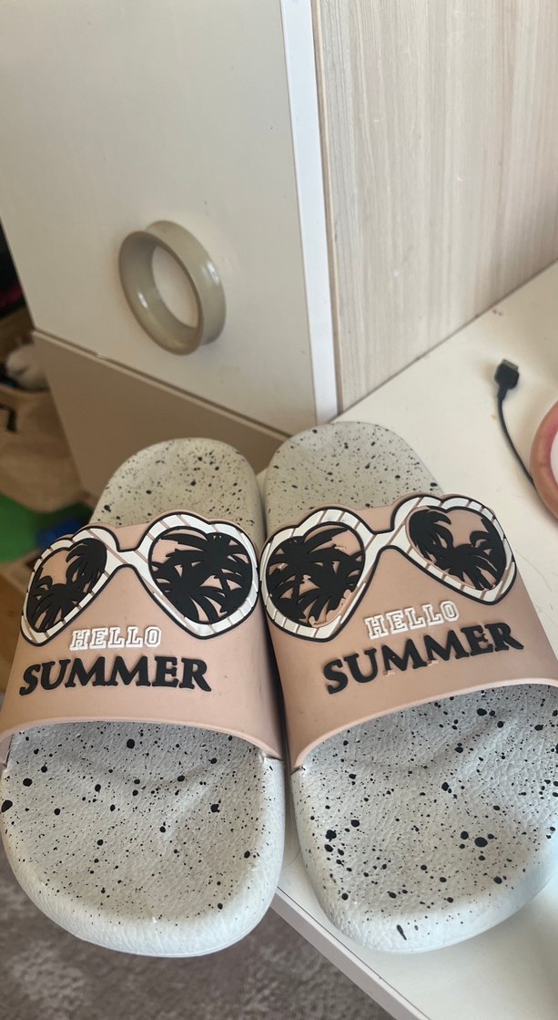 Baskılı güneş gözlüğü desenli, kemerli bej renk kız terlikleri. Üzerinde "HELLO SUMMER" yazısı bulunur, rahat ve trend görünümlü.