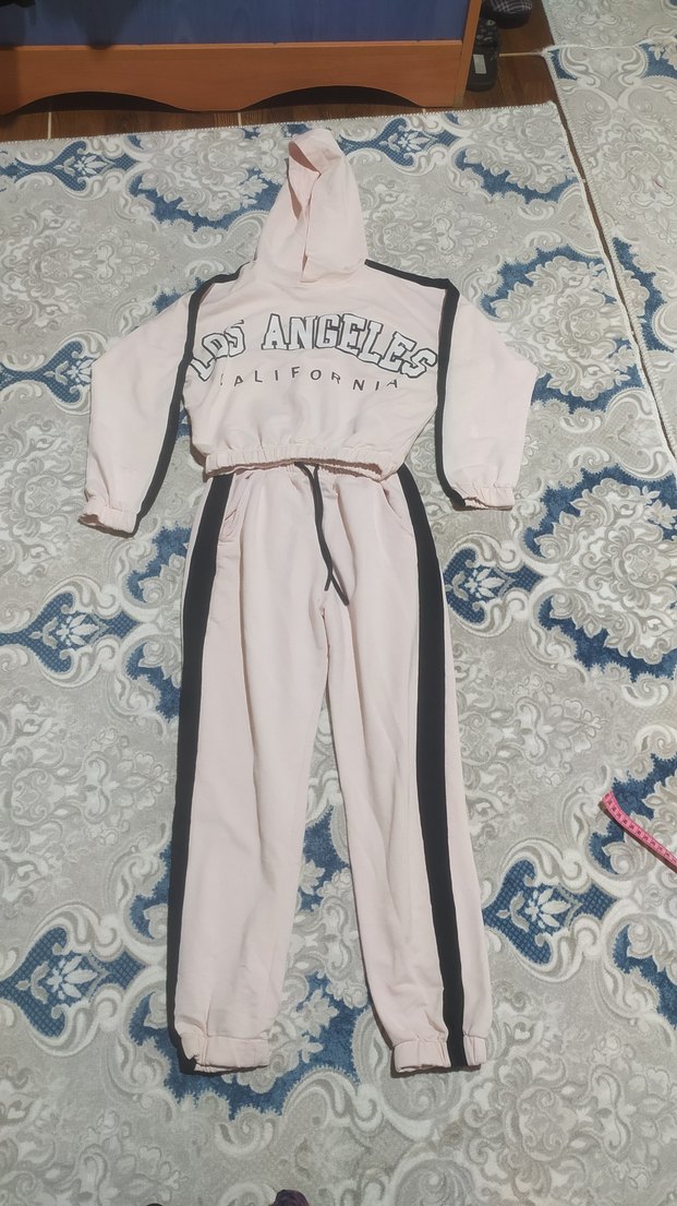 Pastel pembe renkli, kapüşonlu ve uzun kollu kız eşofman takımı. Kemerli ve siyah yan şerit detaylı, kullanıma bağlı bazı kusurları vardır zaten fiyata yansıtım