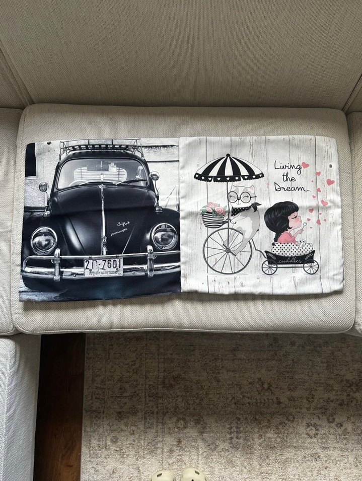 Çok az kullanıldı. Sorunsuzdur. Boyutları: Kedi ve kız 41x41 Araba 41x41 İç dolgu dahil değildir.