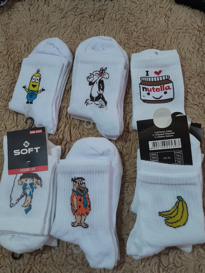 Yumuşak kumaştan, çizgi film karakterleri ve Nutella kavanozu baskılı, beyaz kısa çoraplar. Adet fiyatıdır.