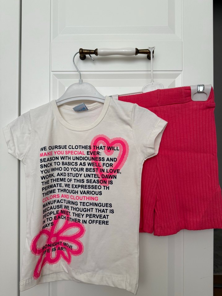 Baskılı kısa kollu üst ve pembe fitilli şorttan oluşan bebek kız takımı. Açık pembe renk yumuşak bir görünüm sağlar.yeni hic kullanilmamis dir