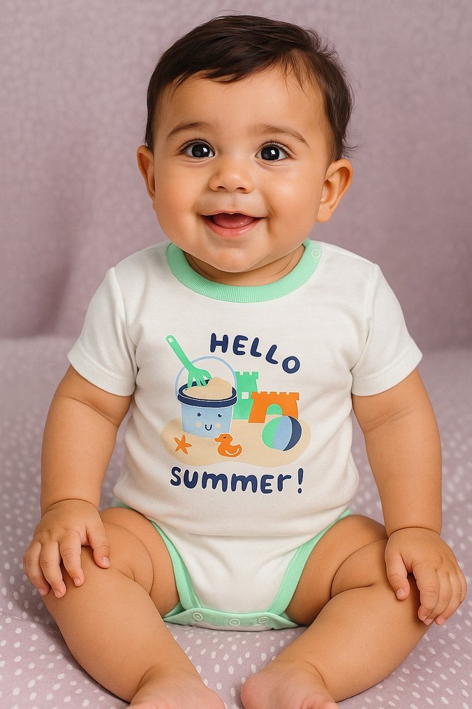 Pamuklu kumaştan, kısa kollu ve yuvarlak yakalı bebek tulumu. Sıfır üründür 6-9 aydır