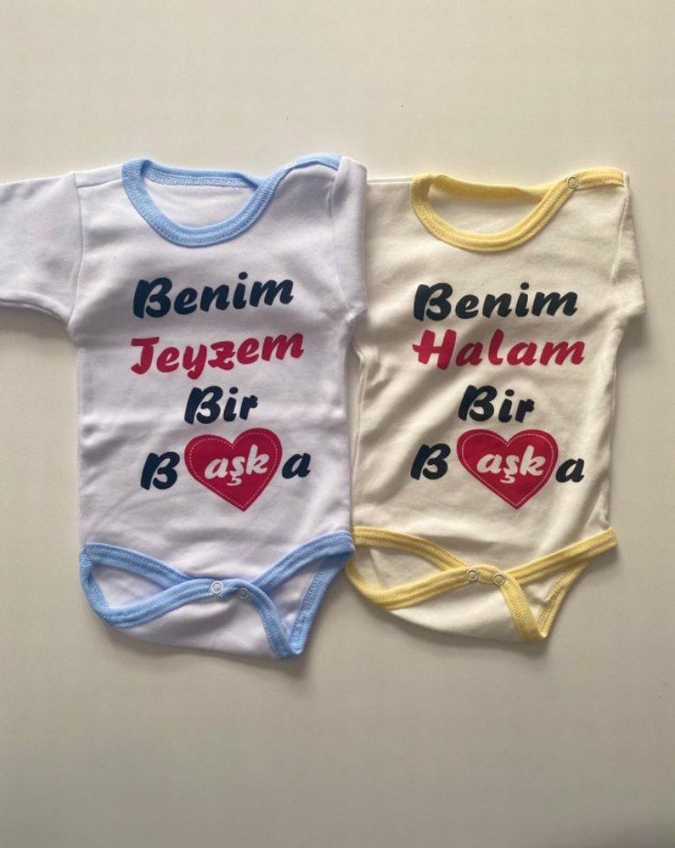Beyaz, kısa kollu, yuvarlak yakalı bebek body. Renkli baskılı yazı ve kalp detaylı, açık pastel renkli kenarlıklar içerir. 0-3 yaş arası mevcuttur.