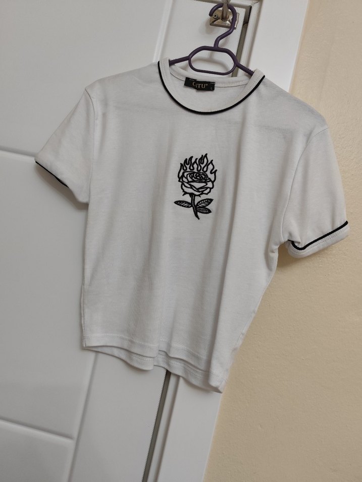 Pamuklu, kısa kollu, bisiklet yaka beyaz tişört, siyah kenar detayları ve alevli gül baskısıyla sade ve şık bir görünüm sunar.