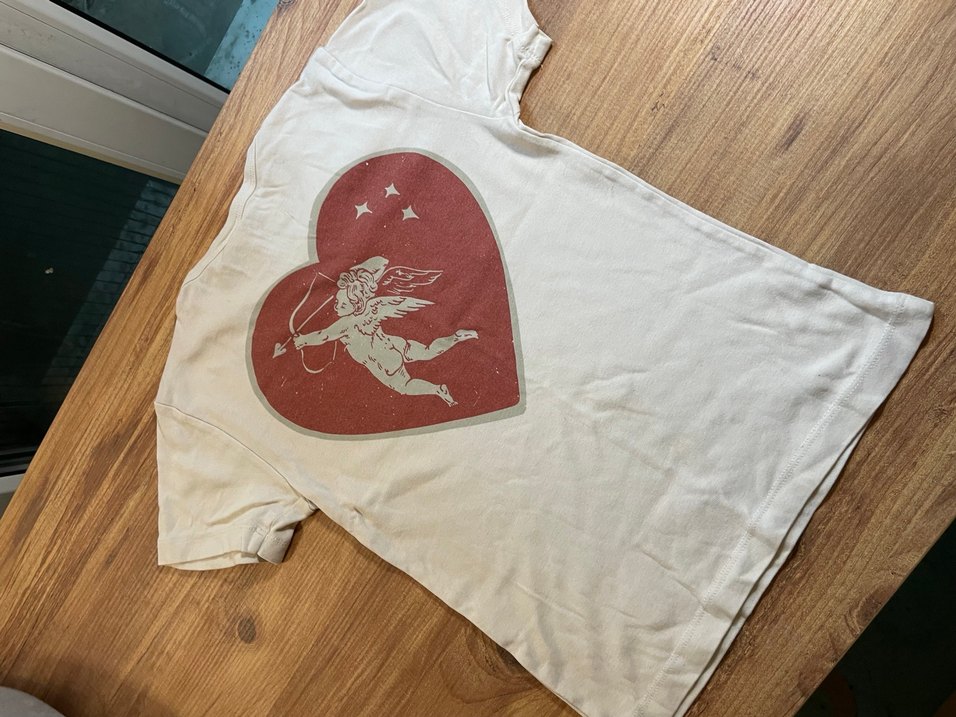 Pamuklu, kısa kollu, bisiklet yaka beyaz hamile tişörtü. Vintage tarzda baskılı okçu melek kalp deseniyle romantik akşamlar için uygun. ❤️
