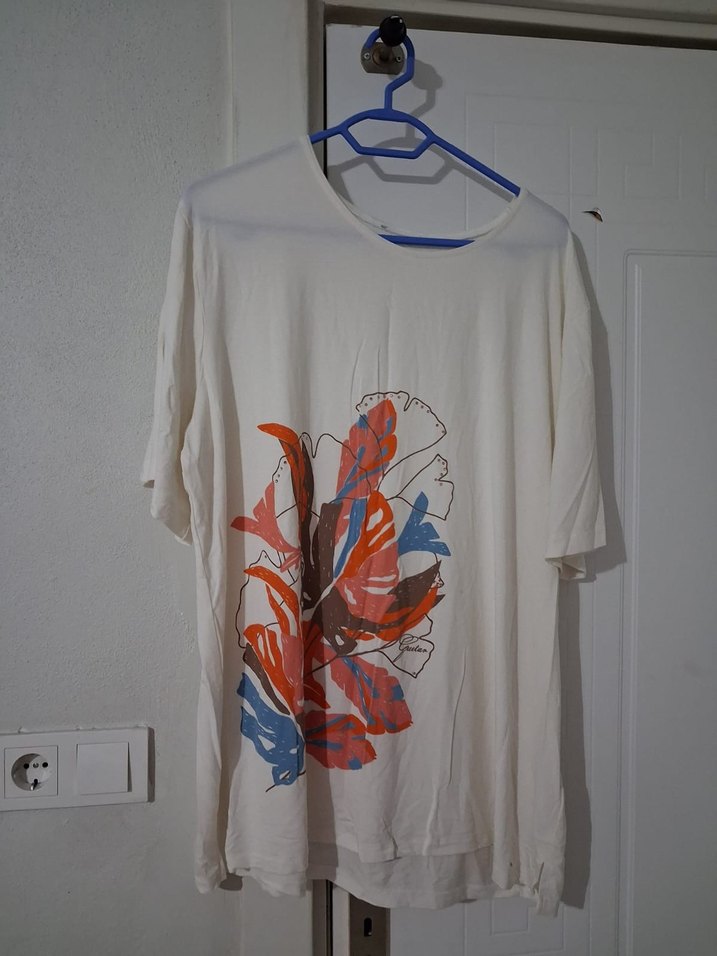 Pamuk kumaştan üretilmiş, baskılı ve drapeli, kısa kollu, bol kesim beyaz hamile tişörtü. Günlük kullanıma uygun rahat bir modeldir.