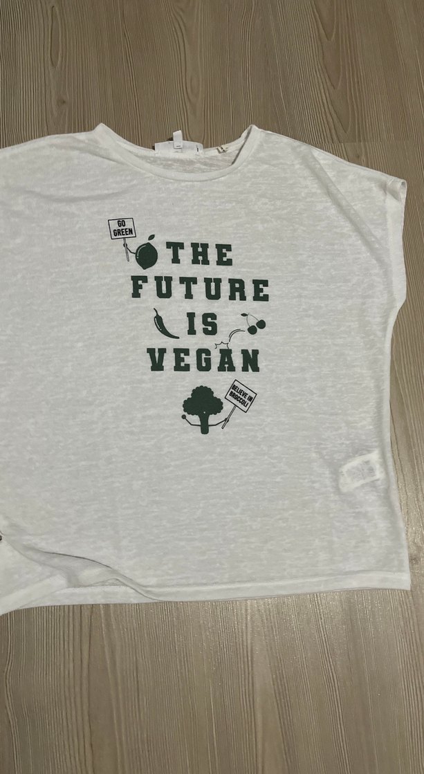 Pamuk kumaştan, kısa kollu ve yuvarlak yakalı bol kesim hamile tişörtü. Gri zemin üzerinde yeşil vegan baskılı mesaj bulunur. Günlük rahat kullanıma uygundur.