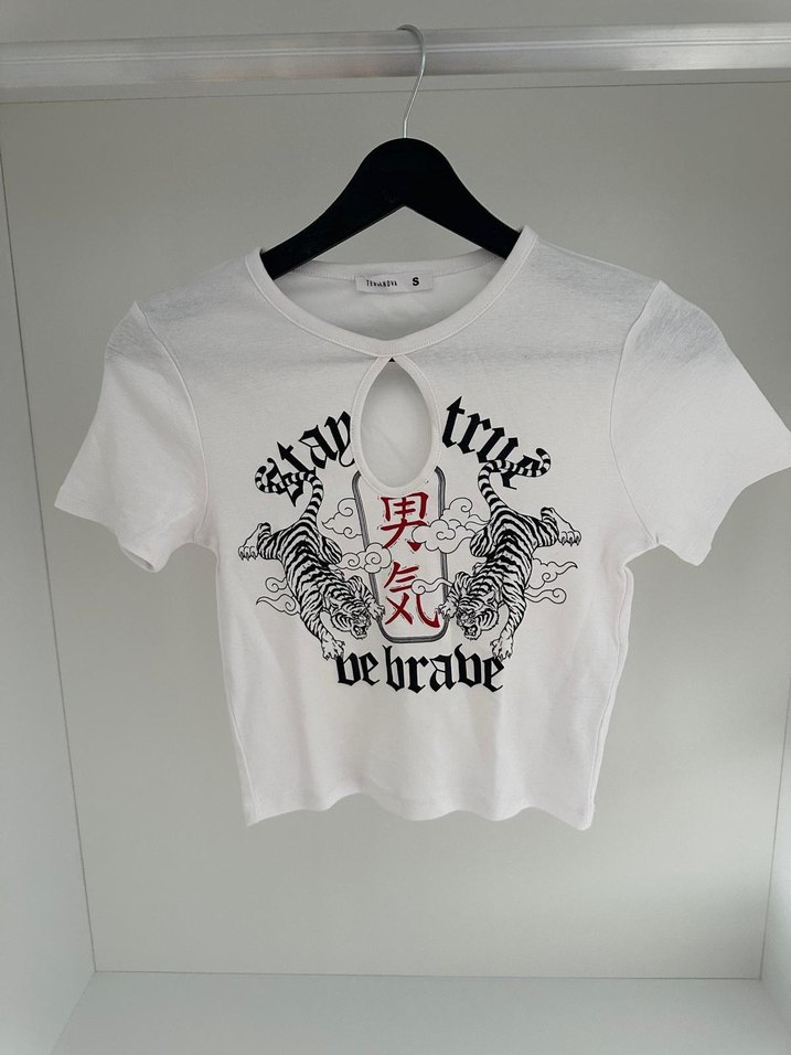 Pamuklu, kısa kollu, fitted kesim beyaz tişört. Yuvarlak yaka ve baskılı kaplan deseni ile 'stay true be brave' yazısı bulunur. Yaka kısmında küçük kesik detay var.