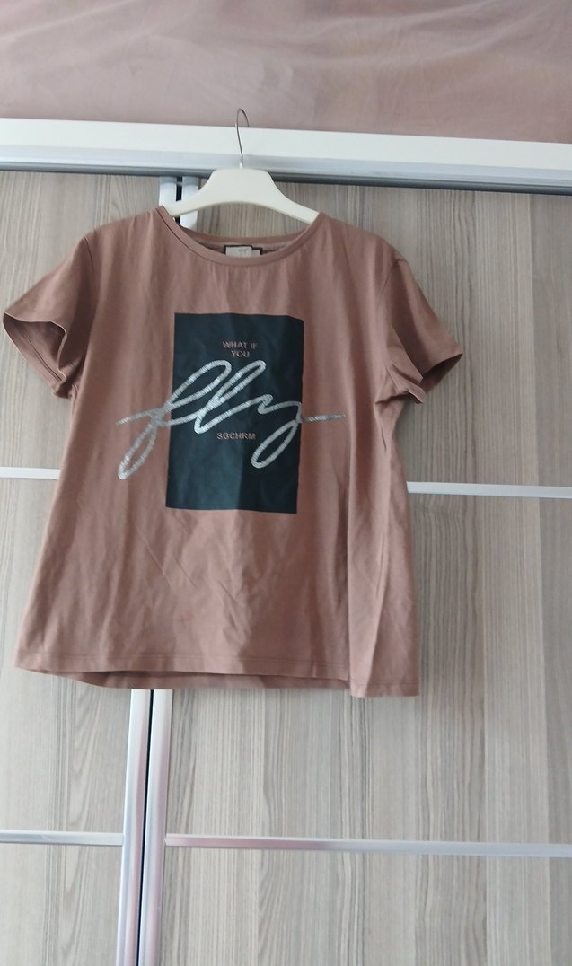Kısa kollu, bol kesim ve kısa boylu kadın tişörtü, yuvarlak yaka ve baskılı desene sahiptir. Yumuşak sentetik kumaştan, pastel kahverengi renkte, günlük rahat stil için uygundur.