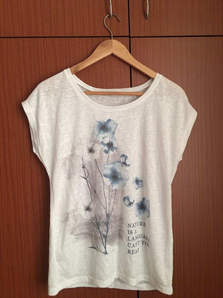 Pamuktan üretilmiş, kısa kollu ve yuvarlak yakalı, bol kesim bluz. Çiçek desenli baskı ve yazı içerir, günlük kullanıma uygundur.