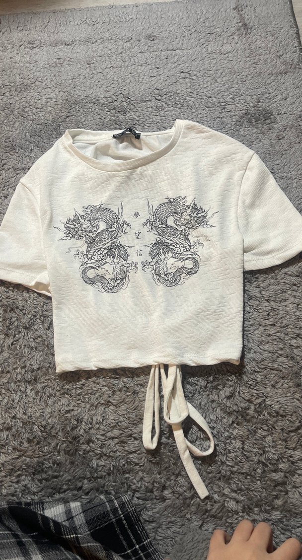 kısa kollu ve yuvarlak yakalı, önü gri ejderha baskılı sırt detaylı crop top. Rahat sokak stili için uygundur.