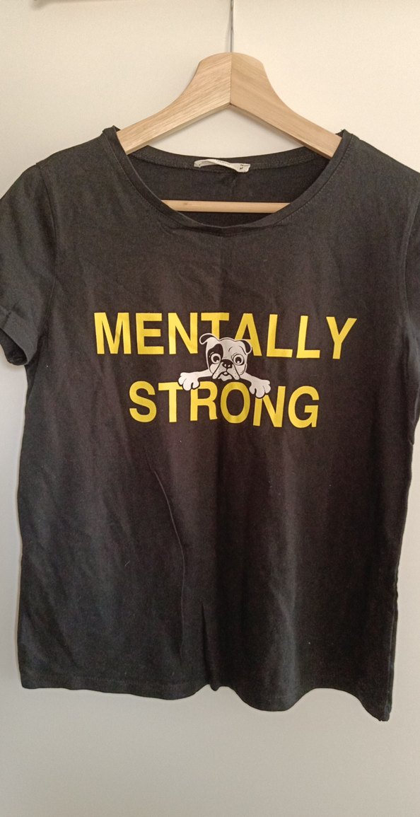 Siyah renkli, baskılı ve kısa kollu kadın tişörtü. Dar kesim, yuvarlak yaka ve köpek figürlü "MENTALLY STRONG" yazısı bulunur. Sentetik kumaştan, spor ve sokak stiline uygun.