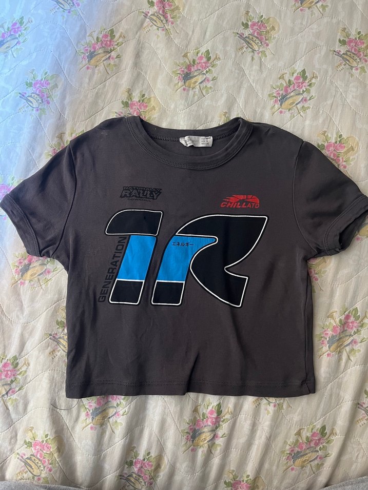 Koyu gri renkte, yumuşak denim görünümlü kumaştan yapılmış, kısa kollu, bisiklet yaka ve baskılı detaylı tişört.