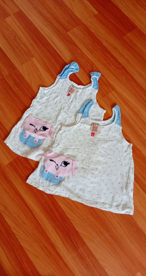 Beyaz baskılı kız çocuk atletleri, pastel mavi fırfırlı askılar ve önünde sevimli hayvan yüzü tasarımları bulunur. Yumuşak ve rahat kumaş.(Abla Kardeş kombini isteyenlere etikette 5 4 yazıyor fakat 7 yaşa kadar olur bedenleri)