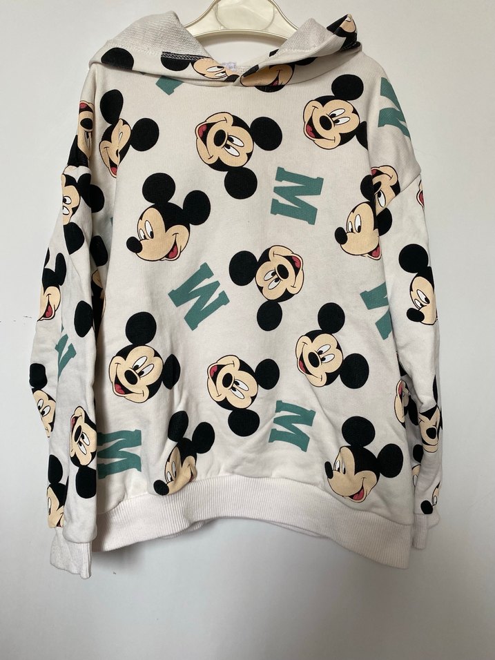 Baskılı Mickey Mouse desenli, kapüşonlu, uzun kollu kız sweatshirtü. Gri tonlarda, örgü dokulu ve rahat kesim sunar. Yakasinda ufak bir sarilik var beklemekten olmus yikaninca çıkar sanırım