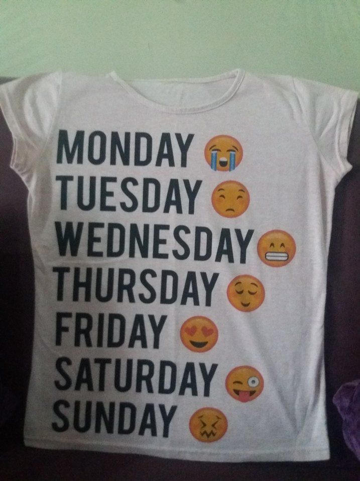 Yuvarlak yakalı, kısa kollu ve salaş kesim kız tişörtü. Beyaz üzerine gri haftanın günleri ve emoji baskıları bulunur. Plastik hissi veren kumaştan üretilmiştir.