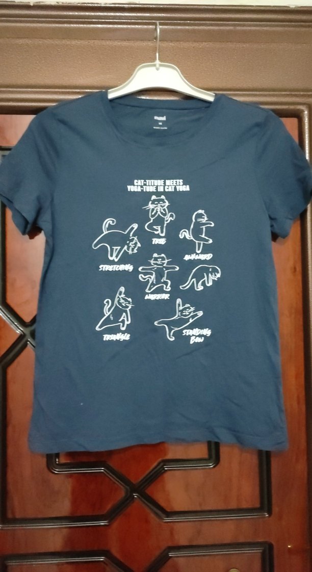 Koyu mavi renkte, kısa kollu ve bisiklet yakalı kız çocuk tişörtü. Denim kumaştan, bol kesim ve baskılı kedi yoga figürleriyle süslenmiş. Trendy sokak tarzına uygun.