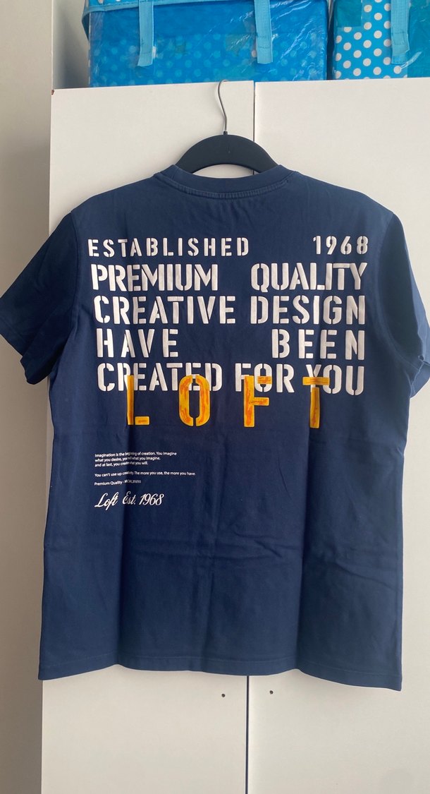 Koyu mavi denim Loft tişörtü, kısa kollu ve yuvarlak yaka. Sırtında "Established 1968, Premium Quality, Creative Design, Have Been Created For You LOFT" baskısı bulunur. Rahat, midi boy, günlük kullanıma uygun.