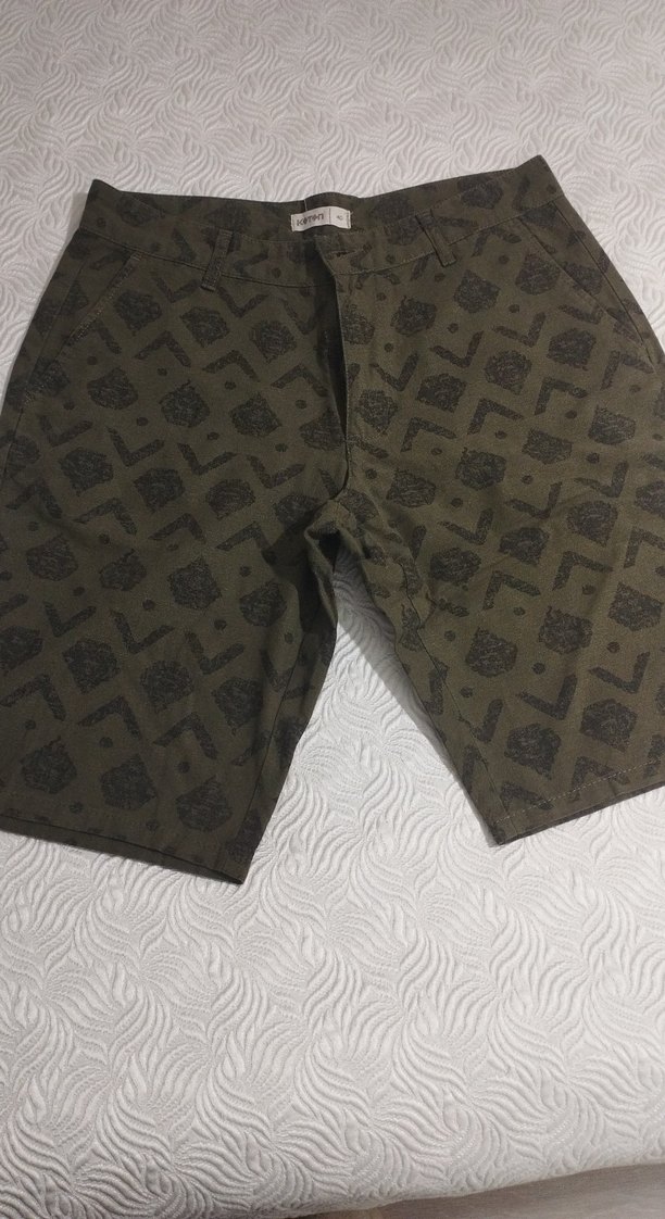 Kemerli, kısa boy, baskılı desenli erkek şortu. Sentetik kumaştan üretilmiş, yesil ve gri tonlarda, günlük sokak stili için uygun.