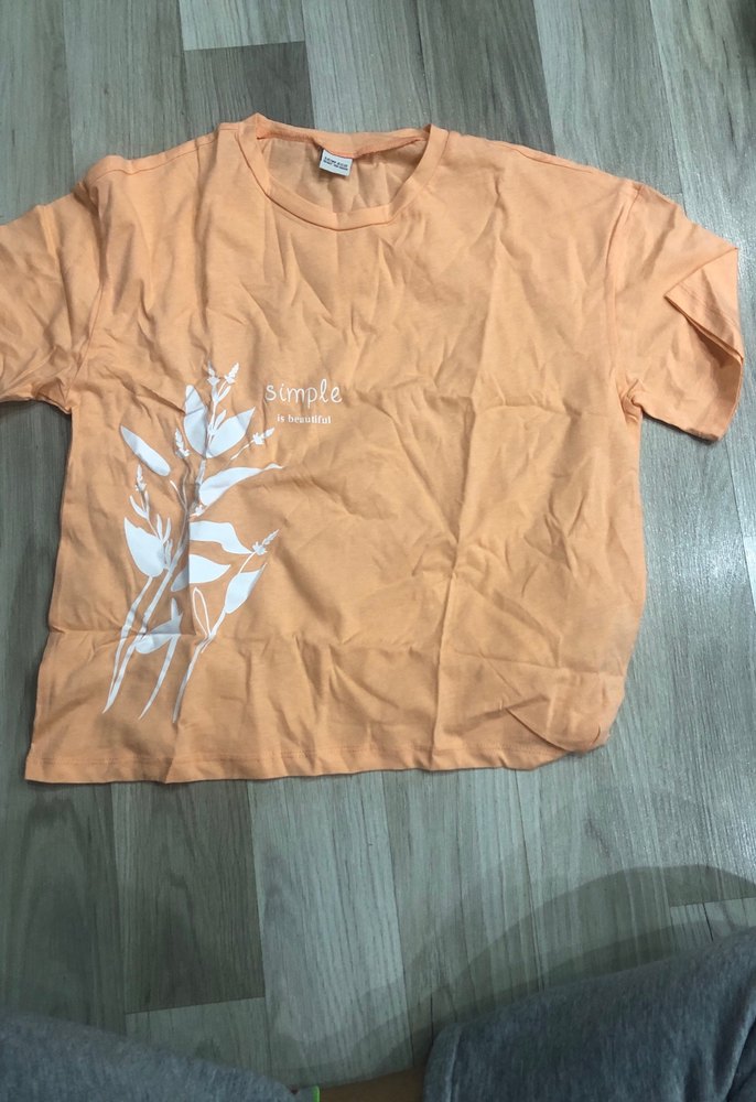 Krem renkli, kısa kollu, yuvarlak yaka kız tişörtü. Baskılı yaprak ve "simple" yazısı ile sade ve rahat bir tasarıma sahip.