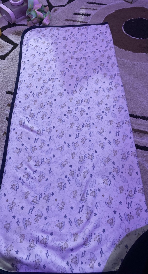 Mor ve gri tonlarda baskılı desene sahip, yumuşak sentetik kumaştan çocuk battaniyesi. Sıcak ve eğlenceli tasarım sunar.