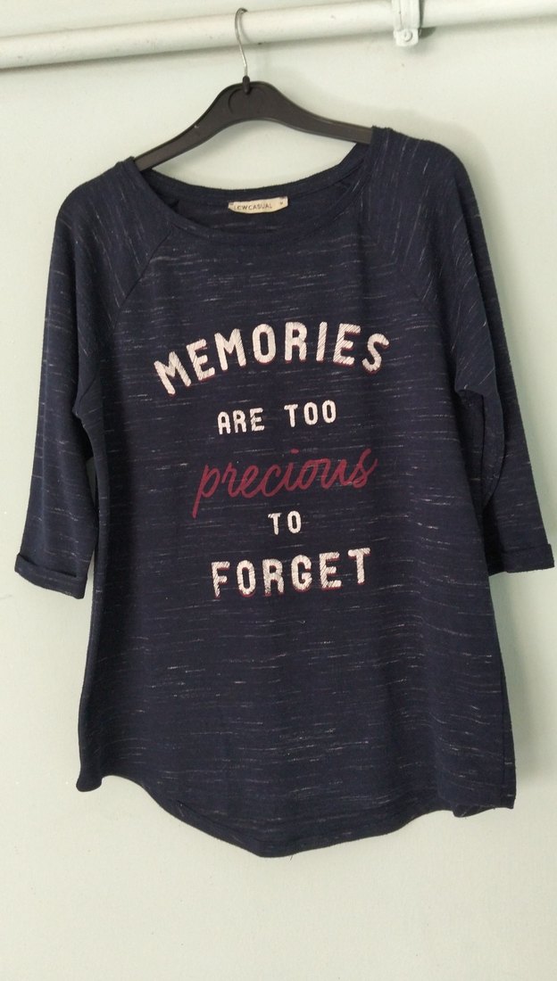 Uzun kollu, yuvarlak yaka ve bol kesim hamile tişörtü. Mavi denim görünümlü kumaştan, önünde "MEMORIES ARE TOO precious TO FORGET" yazılı baskı bulunur. Günlük kullanıma uygun.