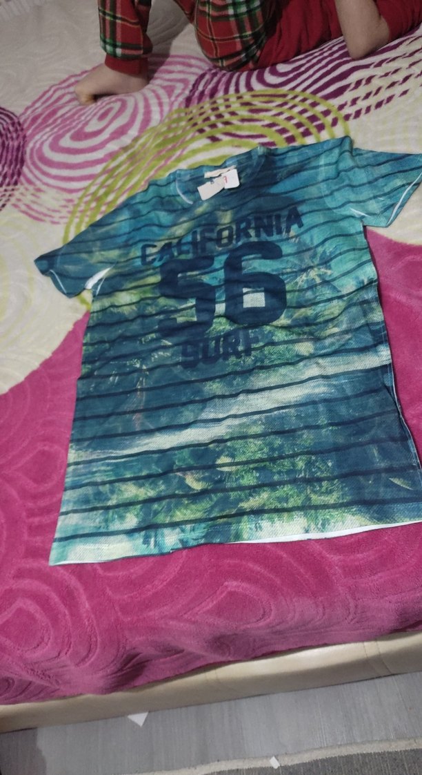 Rahat kesim, kısa kollu ve yuvarlak yakalı baskılı mavi erkek tişörtü. Yumuşak sentetik kumaştan üretilmiştir.
