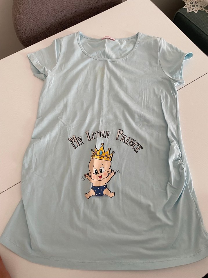 Pamuklu, kısa kollu, yuvarlak yakalı, bol kesim mavi hamile tişörtü. Üzerinde 'My Little Prince' yazılı baskı ve sevimli bebek figürü bulunur. Günlük rahat kullanım için uygundur.