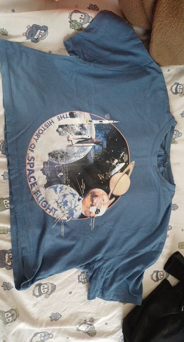 Yumuşak denim kumaştan, baskılı uzay temalı bol kesim tişört. Yuvarlak yaka, kısa kollu ve tokalı detaylı, vintage sokak stili. Günlük kullanım için uygundur.Üründe hiçbir kusur yoktur. S bedene ama M bedene de rahatlıkla oluyor.