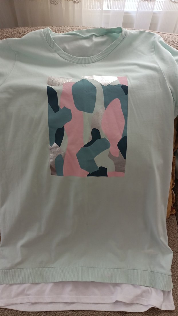 Pastel tonlarda soyut baskı ve rahat kesimle günlük kullanıma uygun.Birkaç kez giyilmiştir Güzel terletmeyen bir penyesi var. 42 bedene XLuyumludur.Ön kısmında hafif bir leke görünüyor kullanmadiğim için yıkanınca çıkar