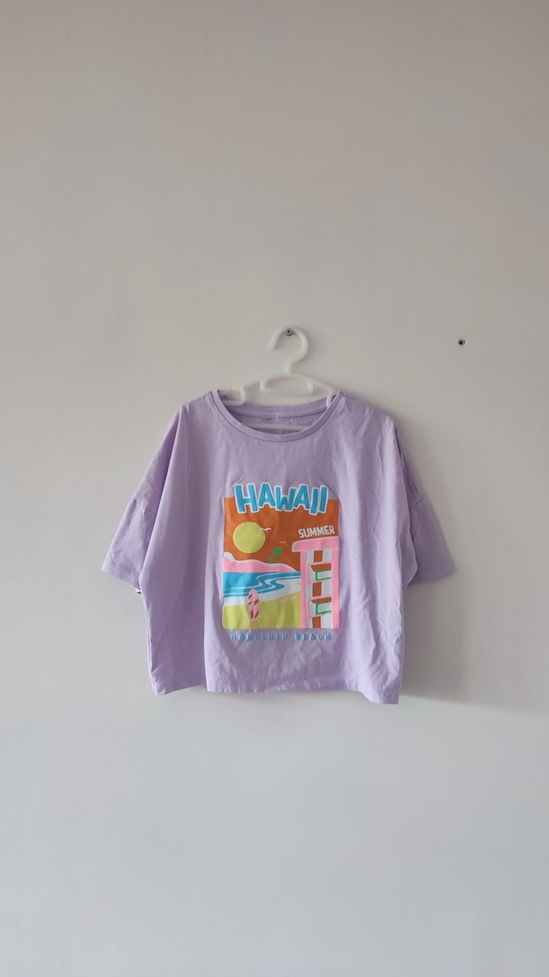 Pamuk kumaştan, bol kesim ve crop kısa kollu mor kız tişörtü. Yuvarlak yaka ve 'HAWAII' yazılı renkli baskı detayına sahip.