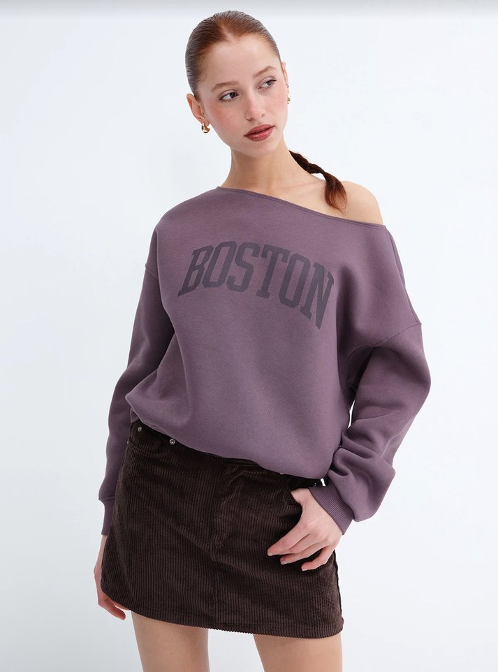 Mor renk, baskılı ve süet dokulu, salaş kesim uzun kollu sweatshirt. Crew neck yakalı, rahat ve şık bir günlük parça.