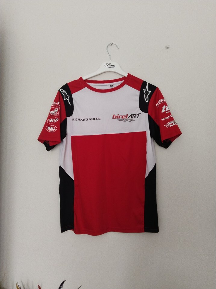 Kırmızı, beyaz ve siyah renklerde baskılı, kısa kollu ve bisiklet yaka tişört. Sentetik kumaş, yapışkan bant detayları ve spor şıklık sunar.