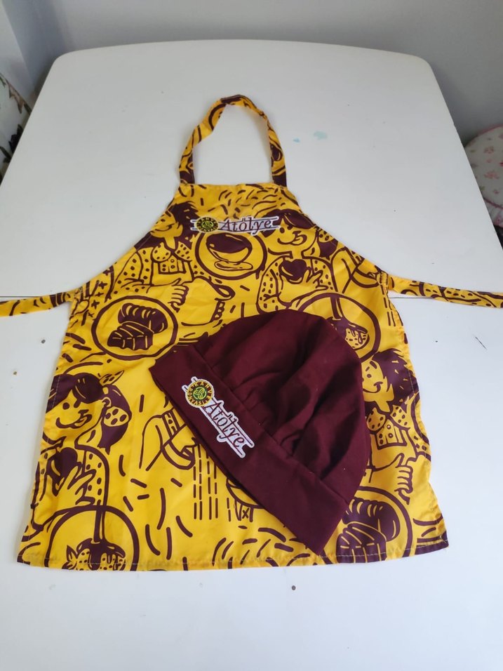 Ayarlanabilir askılı, renkli baskılı mutfak önlüğü ve bordo şef şapkası seti.